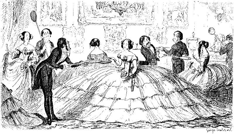 La règle, pou raujourd'hui, c'est d'affecter une grosseur moyenne raisonnabe. Je dis aujourd'hui : qui sait si demain la fantasque déesse qui préside à notre toilette n'aura pas promulgué une autre loi ? Qoi qu'il en soit, les robes continuent à exiger une ampleur excessive, surtout pour le bal. Comme on peut le voir, ci-dessous, la crinoline a été très parodiée et les caricaturistes s'en sont donné à coeur joie comme on peut le voir sur ce site :