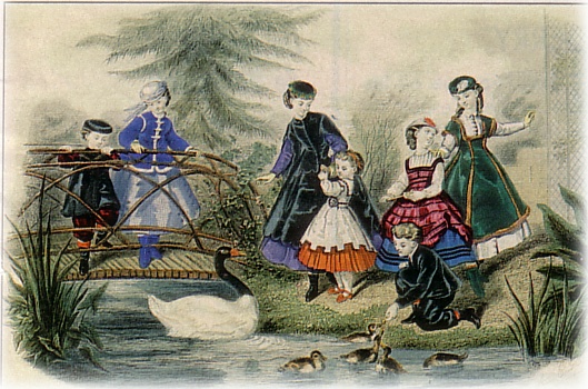 Les décolletés des robes sont carrés, les bretelles passées sur les guimpes sont à la mode. Les corsages sont à basques découpées et les ornements géométriques ont la faveur surtout la forme "dents de scie". Les chapeaux se sont modifiés : ils sont plats et à bords étroits et, bien entendu, eux aussi se plantent sur le front. A partir de 1869, les fillettes portent le "pouf" comme leur mère. La robe s'arrête juste au-dessous du genou et la jupe de dessus est drapée par des cordons ou des fronces. La forme de polonaise à trois pans imite la forme portée sous le régime de Marie-Antoinette.