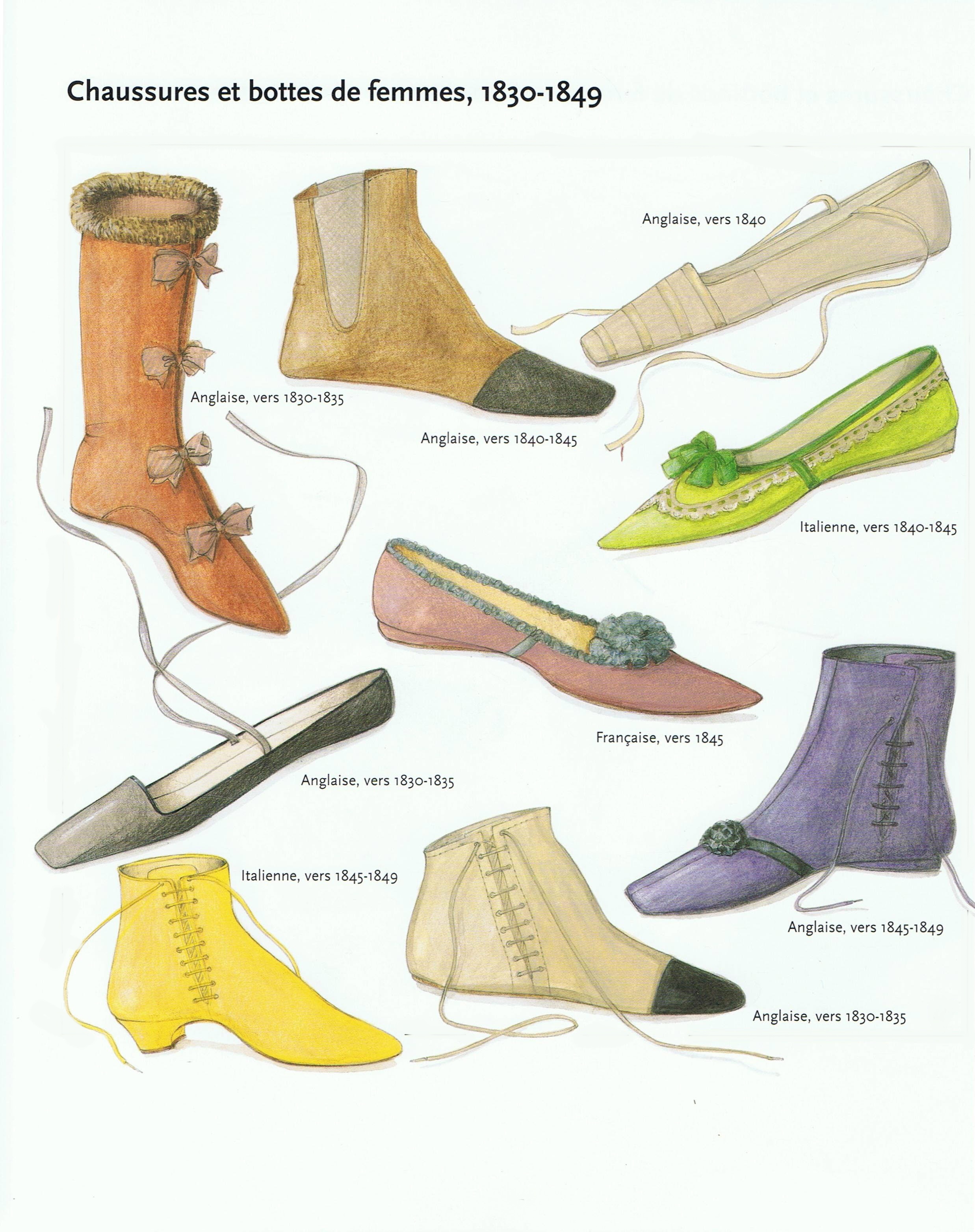 Au début du XIXème siècle, le mot "chausson" désignait toute chaussure fine. Les bottines n'entrent dans les garde-robes élégantes que vers 1830, ellles ont séduit par leur laçage latéral.