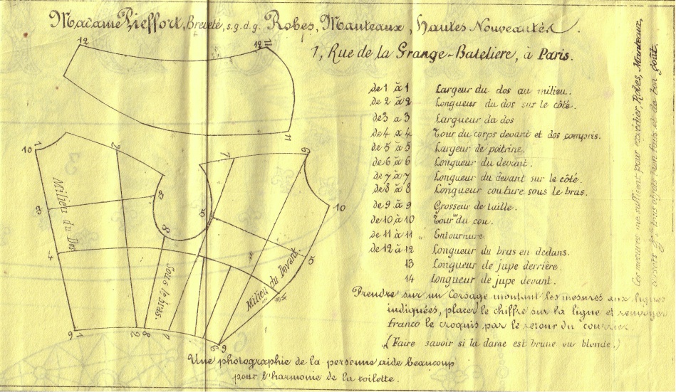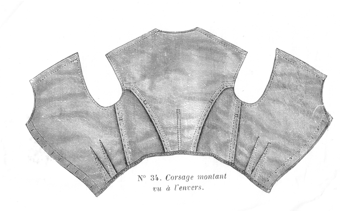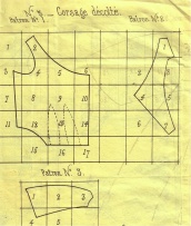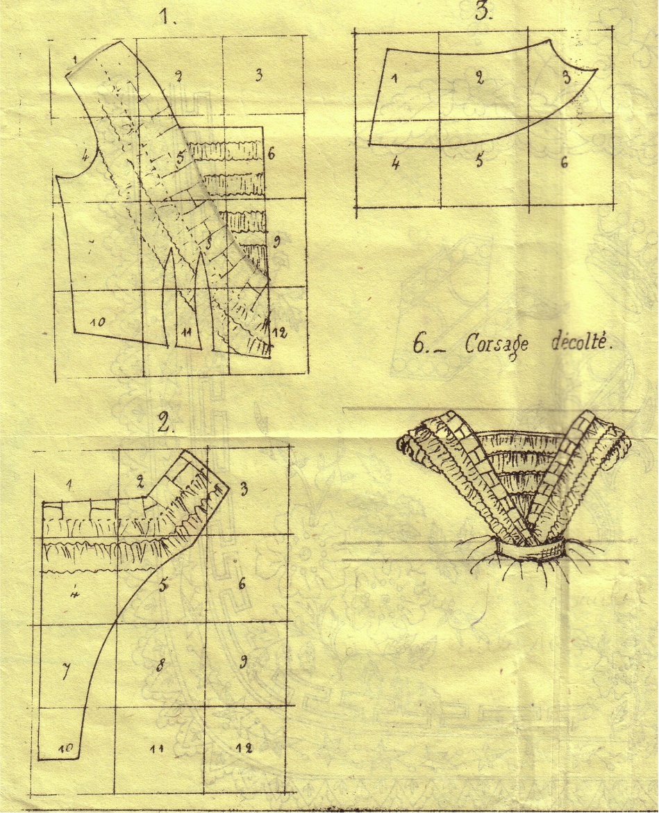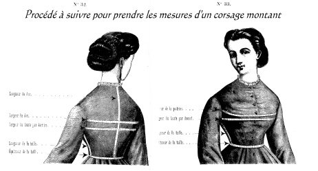 Je dispose également des explications d'un corsage blanc avec fichu et d'un corsage montant de l'année 1865, dont les dessins figurent, ci-dessous, et bien d'autres encore mais malheureusementje ne suis pas en possession des patrons.